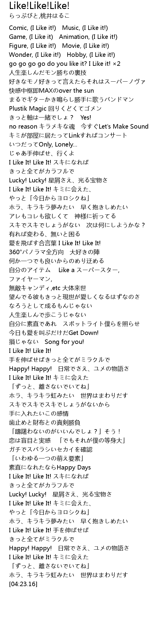 | [02:22.60] | I Like It! Like It! 手を伸ばせばきっと全てがミラクルで |