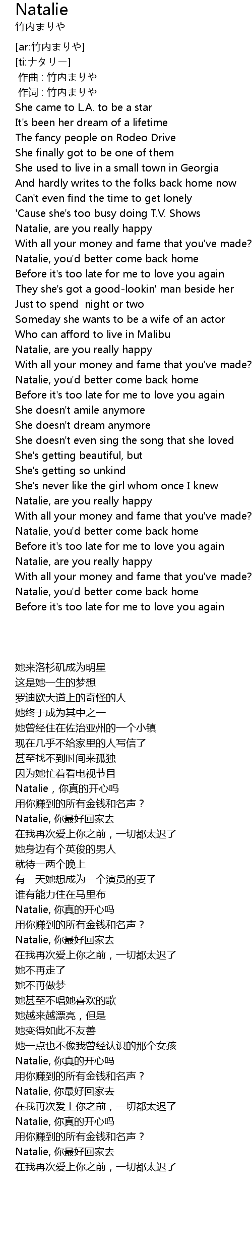 | [01:00.50] | Natalie, you' d better come back home |