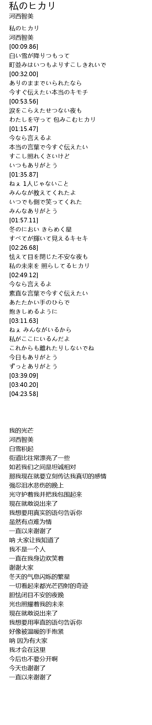 | [02:38.32] | 私の未来を 照らしてるヒカリ |