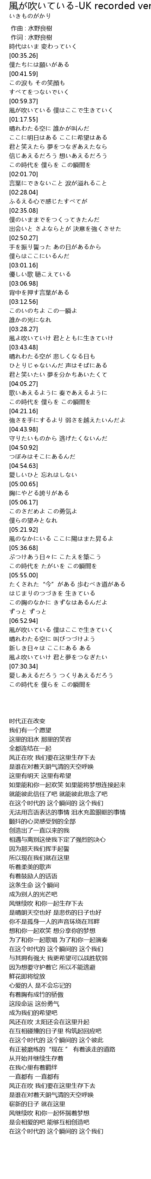 | [03:34.32] | 風よ吹いていけ 君とともに生きていけ |