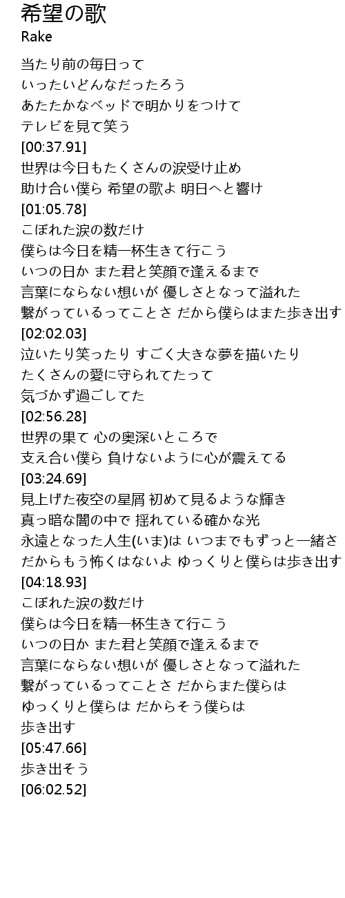 | [00:50.95] | 助け合い僕ら 希望の歌よ 明日へと響け |
