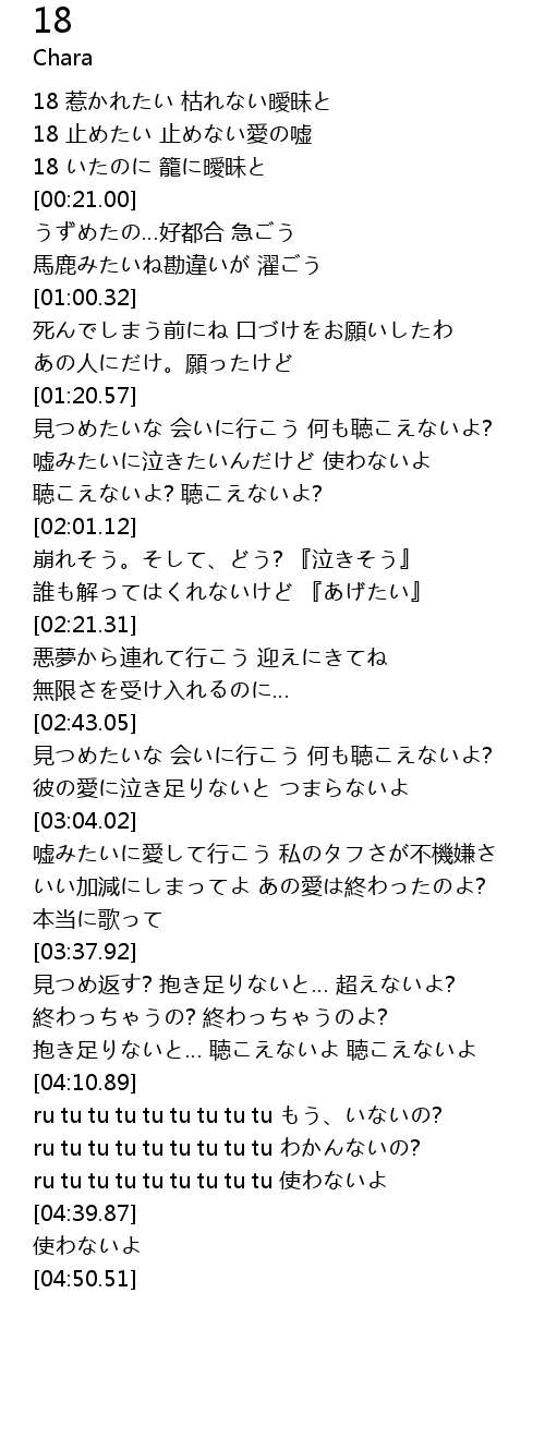| [00:14.77] | 18 いたのに 籠に曖昧と |