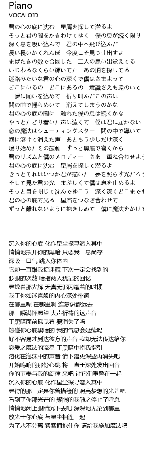 | [00:13.318] | 君の心の底に沈む 星屑を探して潜るよ |