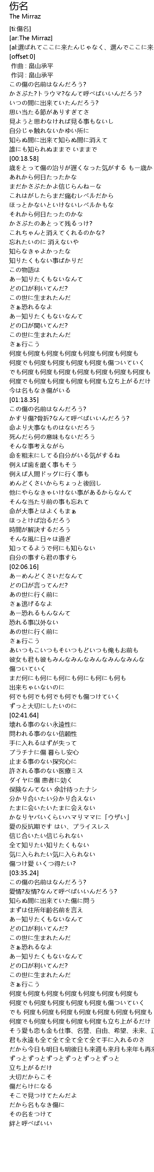| [00:02.92] | この傷の名前はなんだろう? |