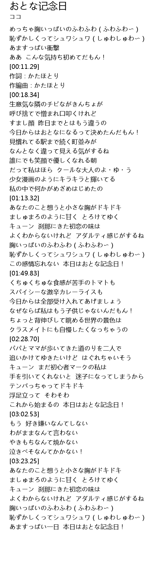 | [01:41.97] | この感情忘れない 本日はおとな記念日! |