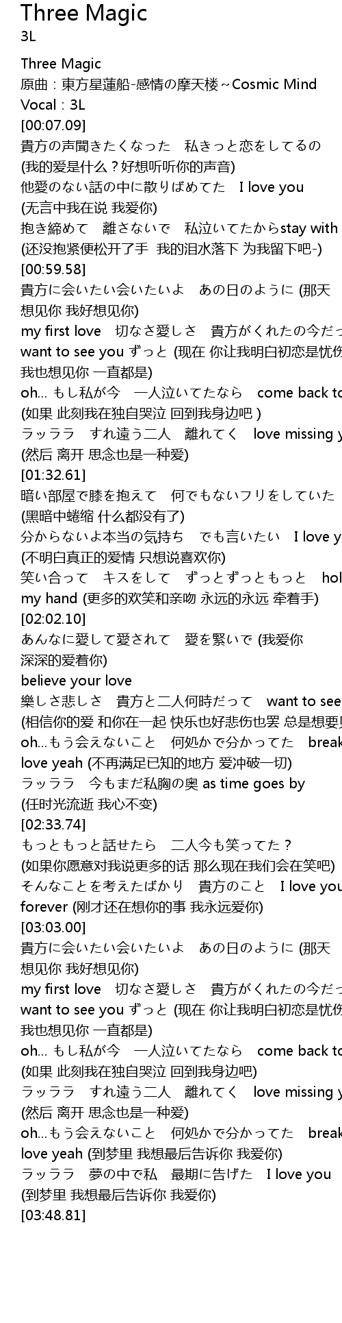 | [00:03.80] | 原曲:東方星蓮船-感情の摩天楼~Cosmic Mind |