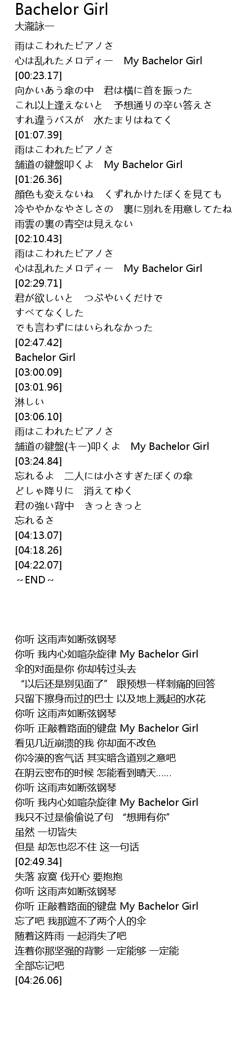 | [03:15.12] | 舗道の鍵盤(キー)叩くよ My Bachelor Girl |