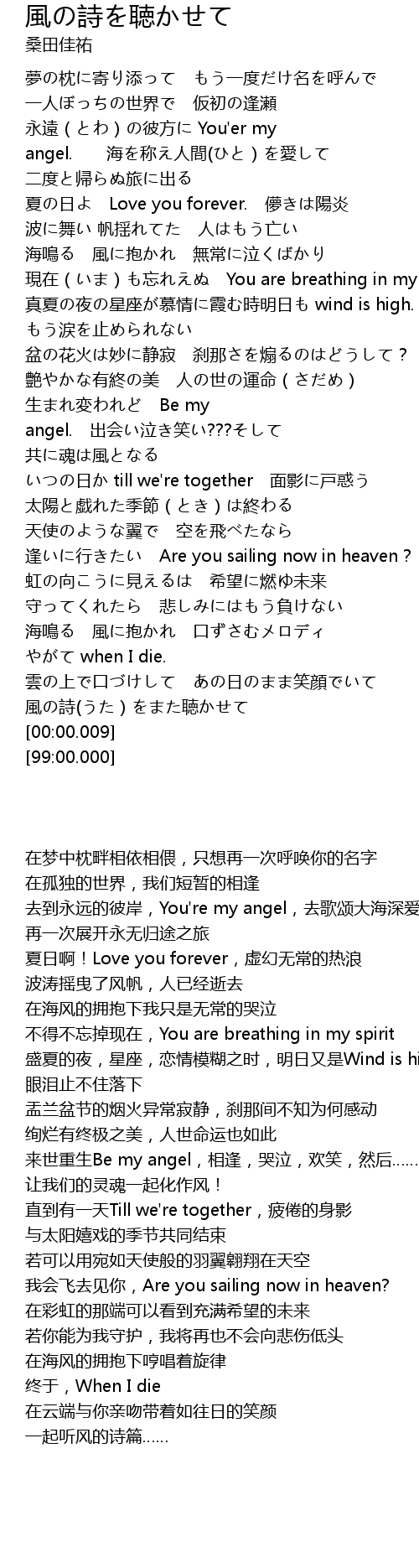 | [00:47.41] | 永遠(とわ)の彼方に You'er my angel. 海を称え人間(ひと)を愛して |