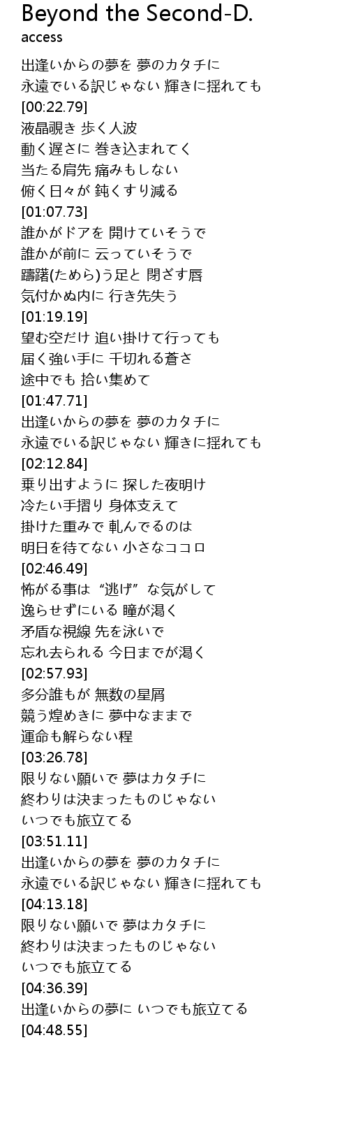 | [04:37.15] | 出逢いからの夢に いつでも旅立てる |
