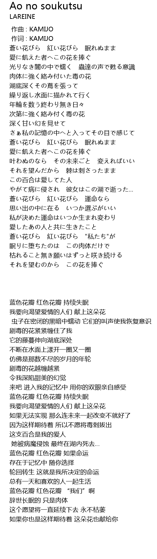 | [01:49.528] | 蒼い花びら 紅い花びら 眠れぬまま |