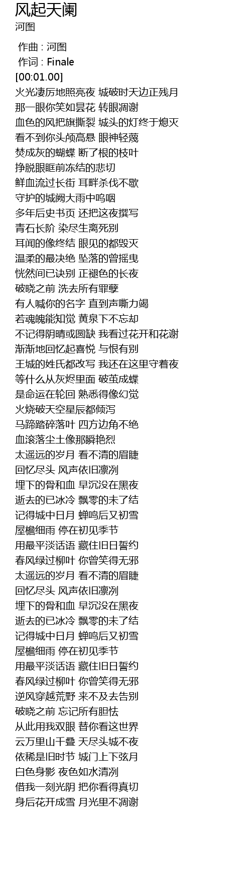 | [00:52.23] | 血色的风把旗撕裂 城头的灯终于熄灭 |