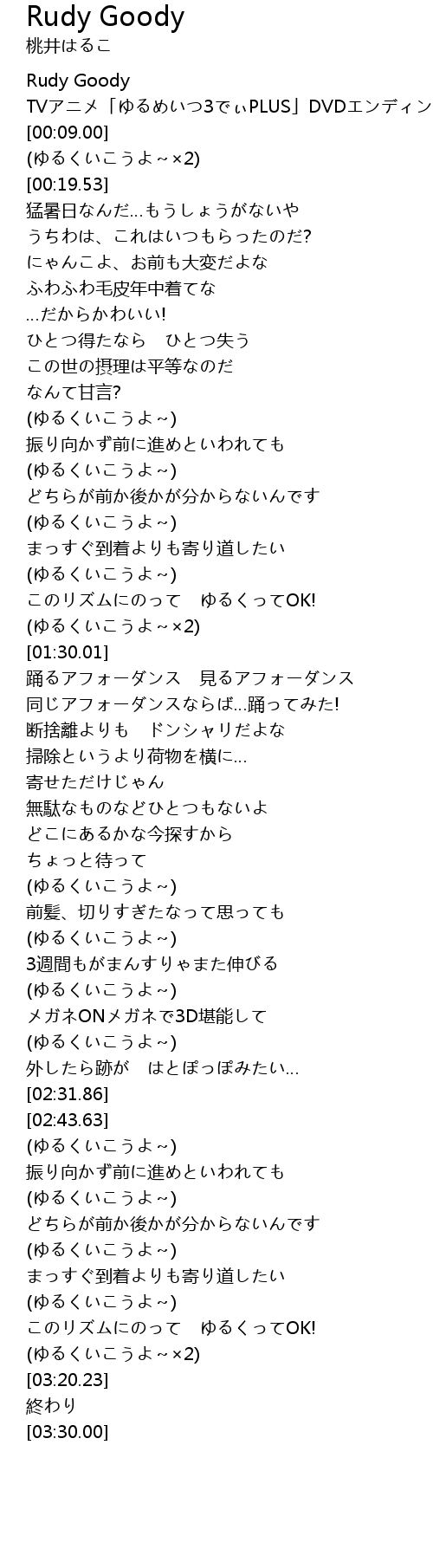 | [00:01.50] | TVアニメ「ゆるめいつ3でぃPLUS」DVDエンディング曲 |
