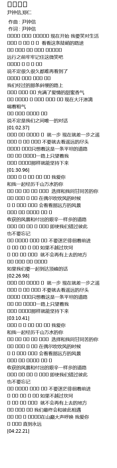 | [01:52.56] | 올라온 만큼 아름다운 우리 길 收获的风景和付出的艰辛一样多的道路 |