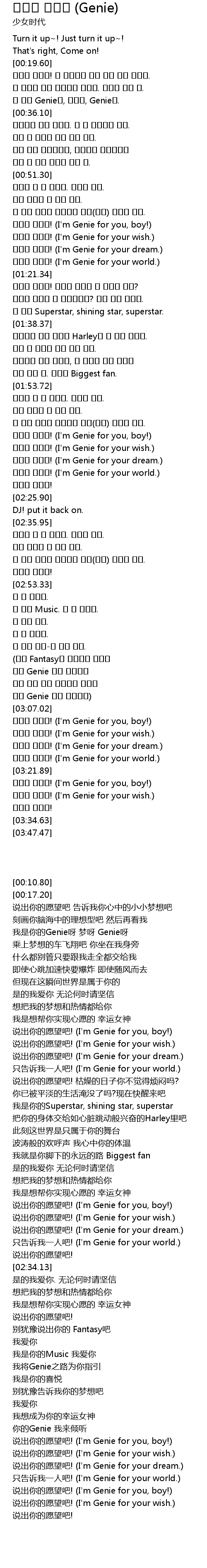 | [03:14.56] | 소원을 말해봐! (I'm Genie for your dream.) |