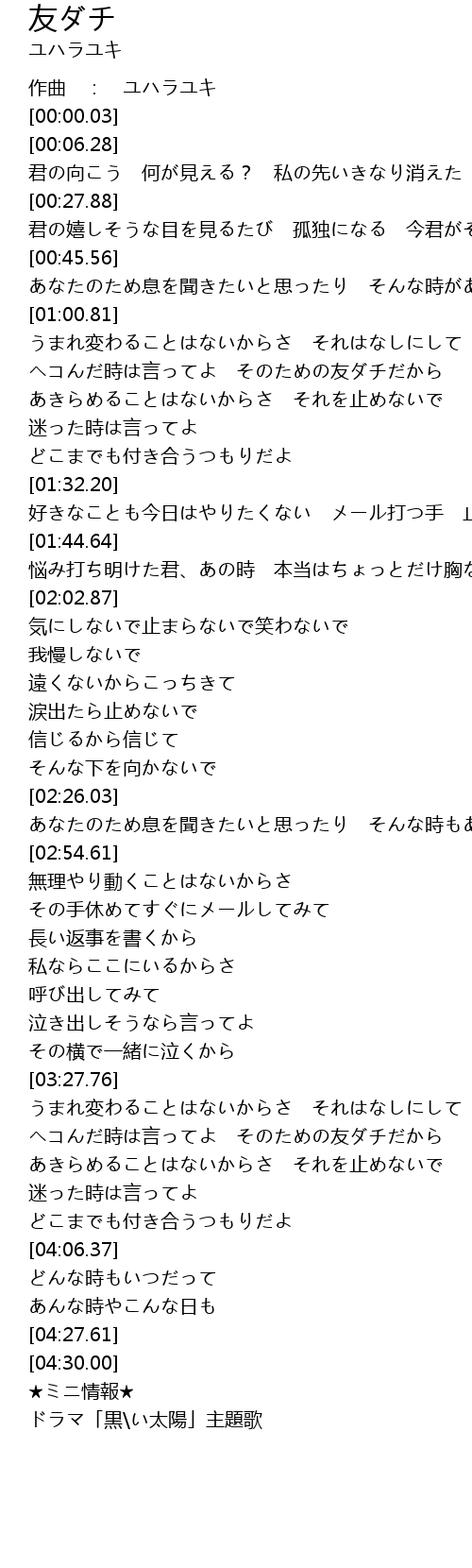 | [03:42.34] | ヘコんだ時は言ってよ そのための友ダチだから |