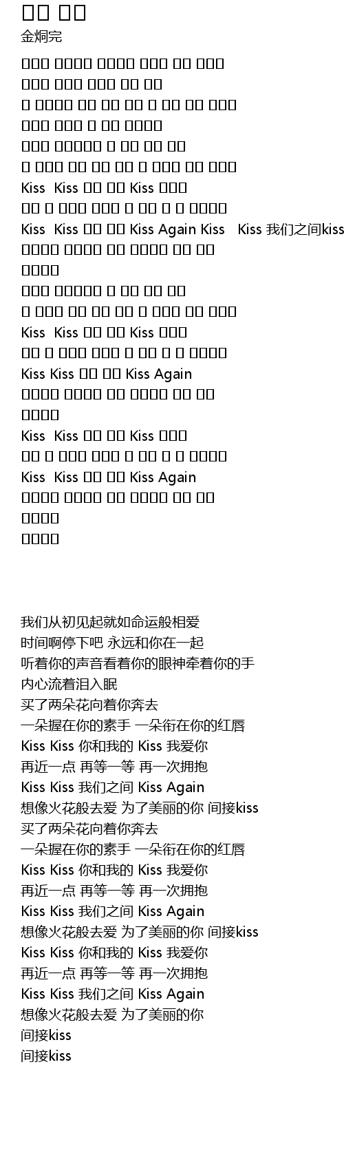 | [01:15.14] | Kiss Kiss 우리 사이 Kiss Again Kiss Kiss 我们之间kiss again |