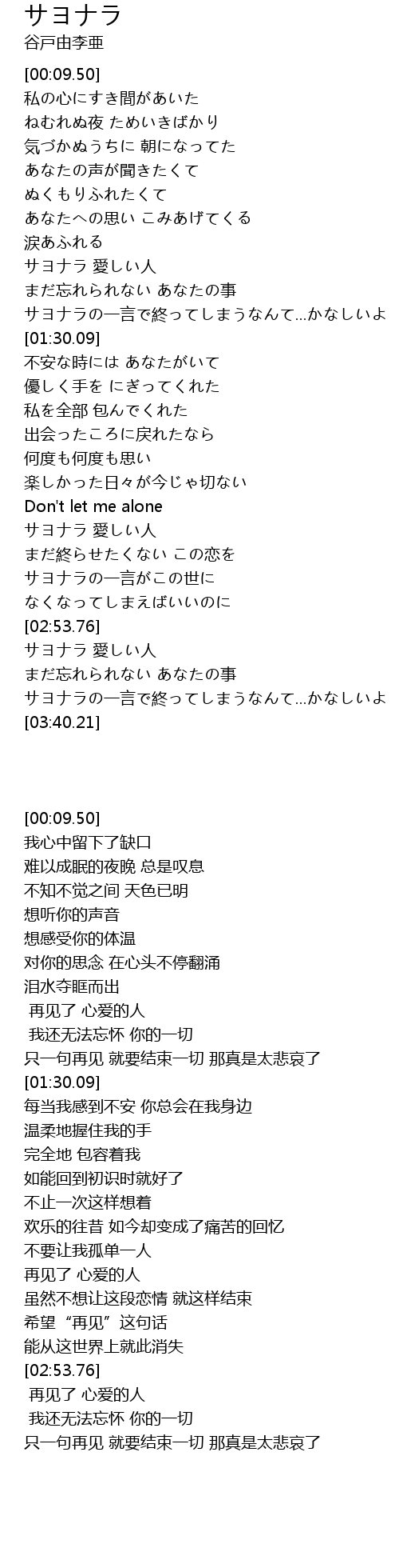 | [03:21.50] | サヨナラの一言で終ってしまうなんて...かなしいよ |