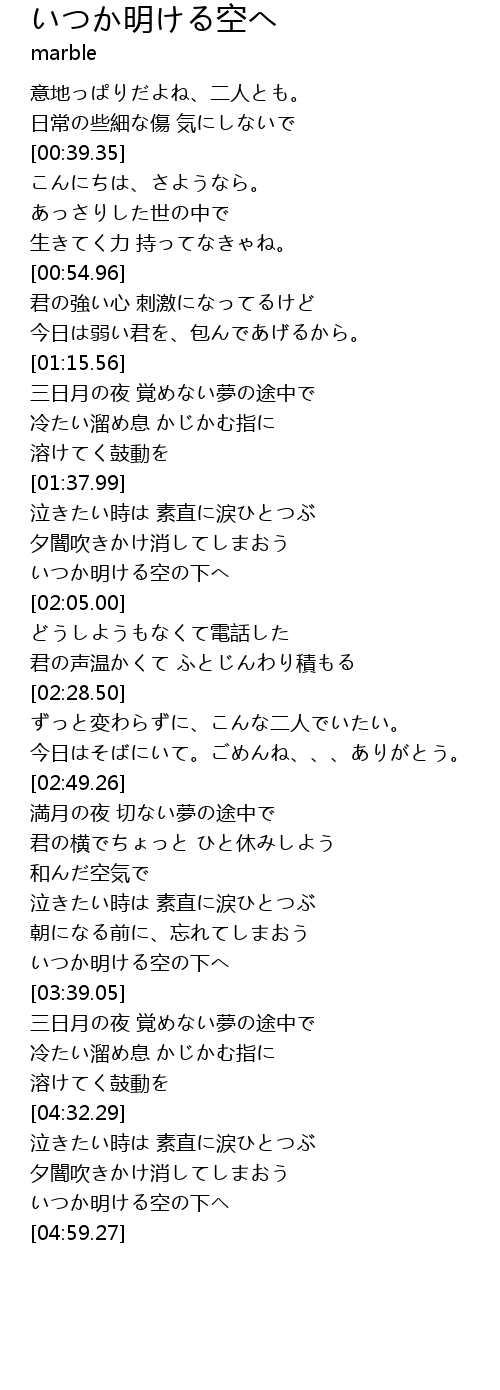 | [01:39.08] | 泣きたい時は 素直に涙ひとつぶ |