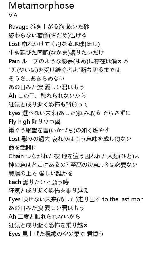 | [00:22.21] | Lost 崩れかけてく母なる地球(ほし) 生き延びた同胞(なかま)護りたいだけ |