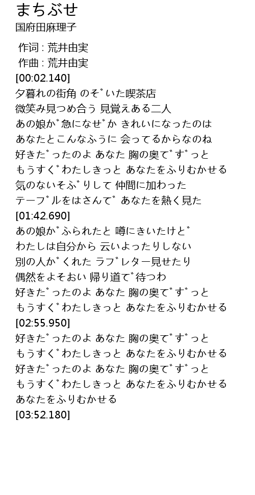 | [03:11.300] | 好きだったのよ あなた 胸の奥でずっと |