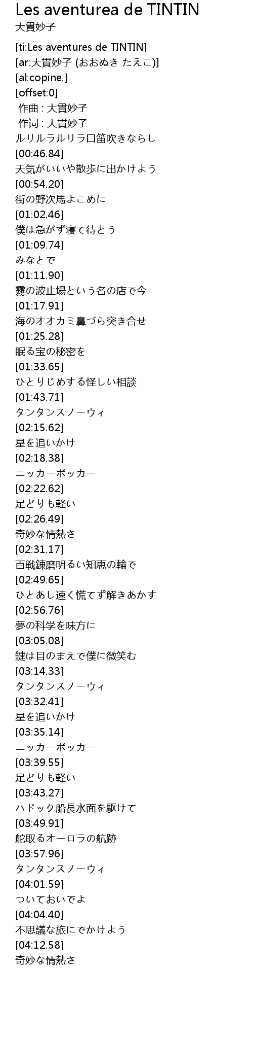 | [00:00.00] | 作曲 : 大貫妙子 |