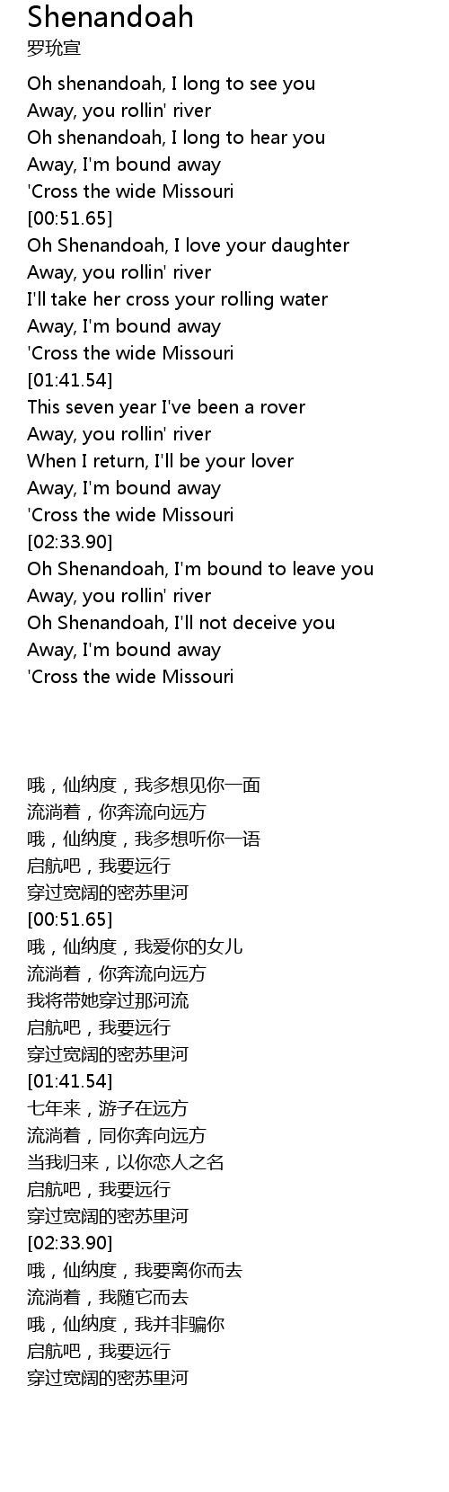 | [00:53.00] | Oh Shenandoah, I love your daughter |