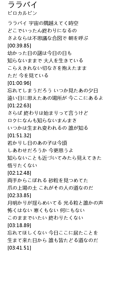 | [00:20.33] | ララバイ 宇宙の隅越えてく時空 |