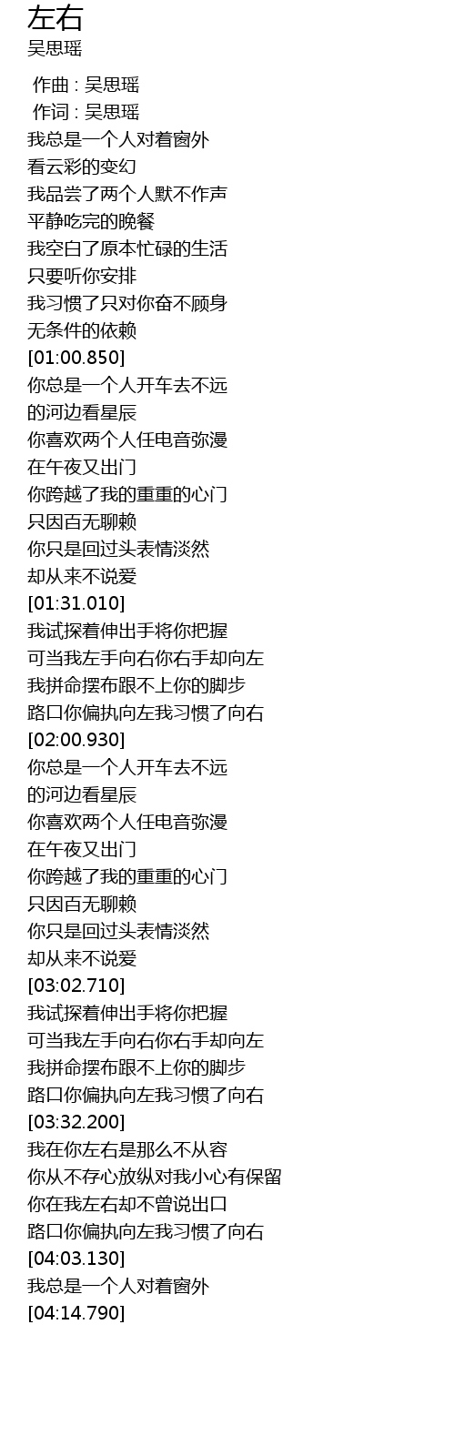 | [03:56.560] | lù kǒu nǐ piān zhí xiàng zuǒ wǒ xí guàn le xiàng yòu |