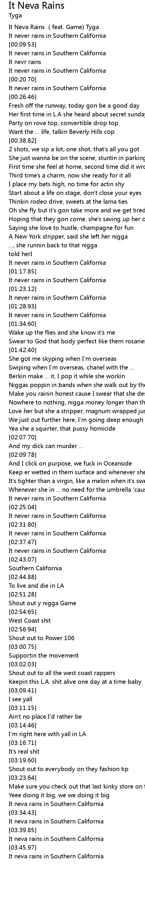 | [00:00.86] | It Neva Rains (feat. Game) Tyga |