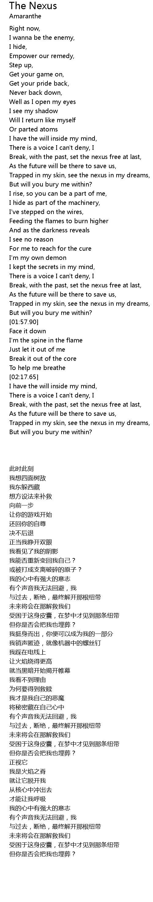 | [01:49.40] | Trapped in my skin, see the nexus in my dreams, |