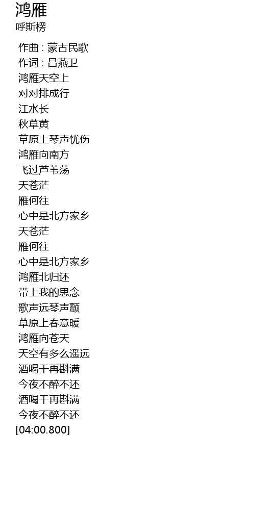 | [01:00.667] | hóng yàn xiàng nán fāng |
