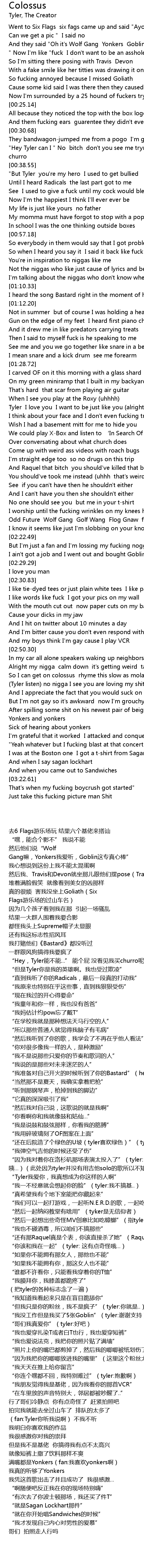 | [02:58.85] | Tyler listen no nigga I see you are loving my shit |