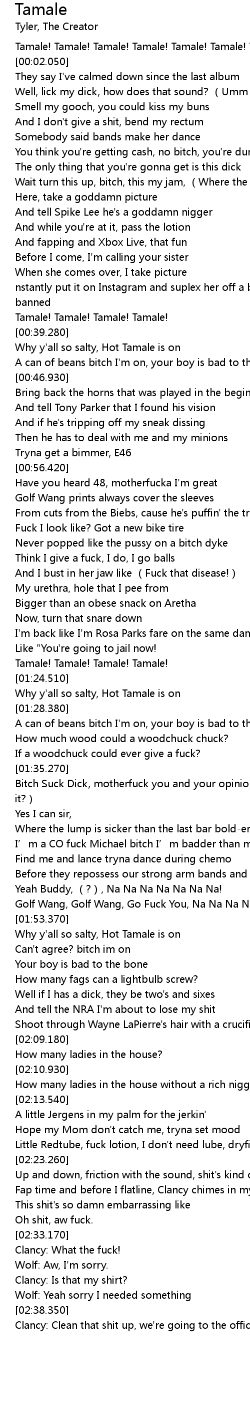 | [01:50.770] | Golf Wang, Golf Wang, Go Fuck You, Na Na Na Na Na Na! |