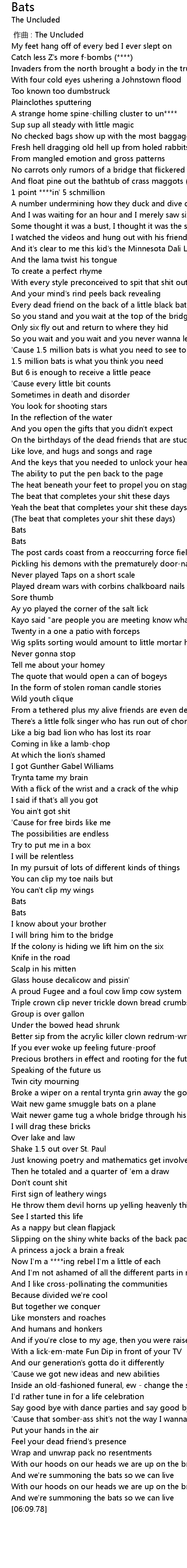| [06:04.18] | And we' re summoning the bats so we can live |
