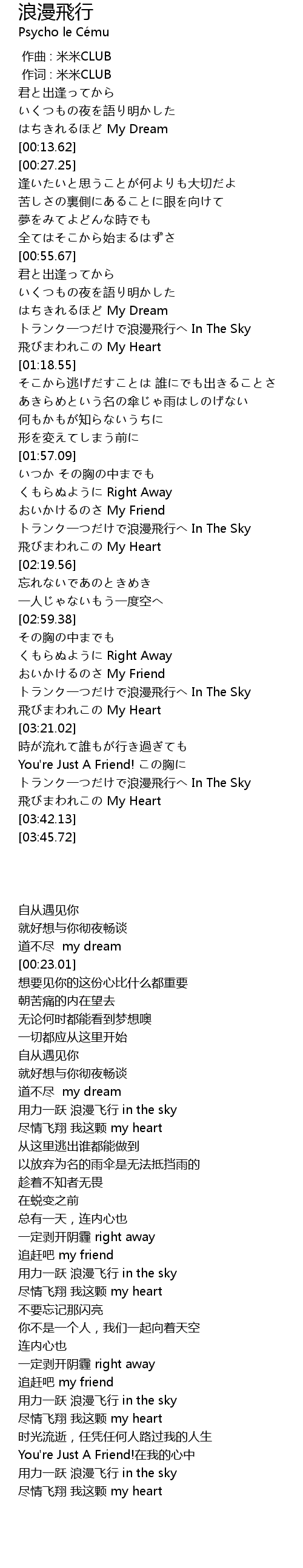 | [03:10.96] | yī làng màn fēi xíng In The Sky |
