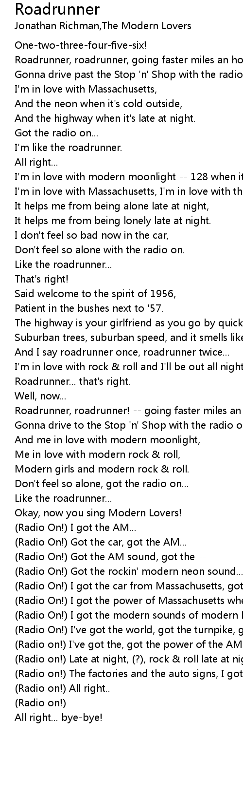 Roadrunner, roadrunner! -- going faster miles an hour. |