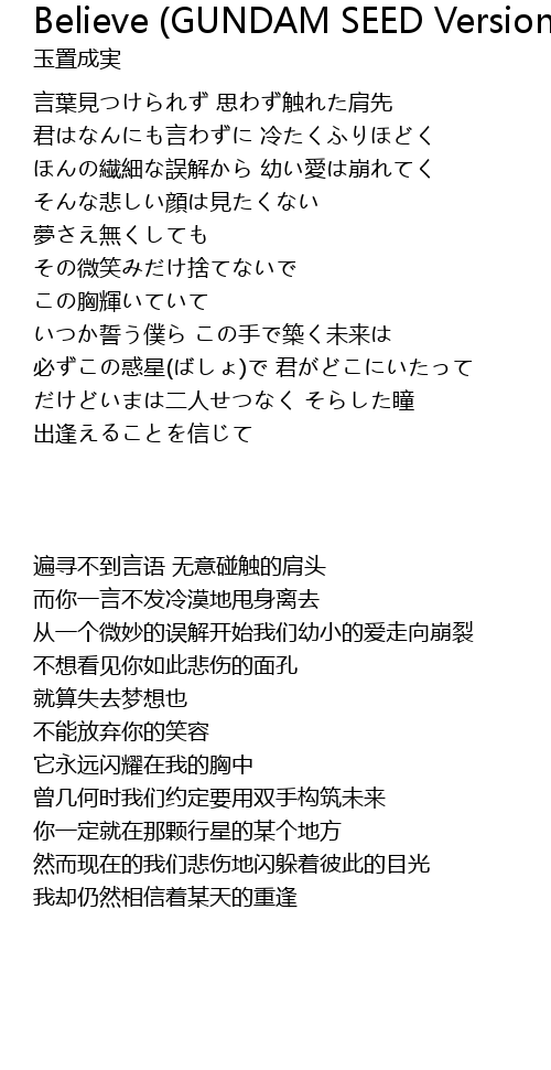 | Song | Believe (GUNDAM SEED Version) |