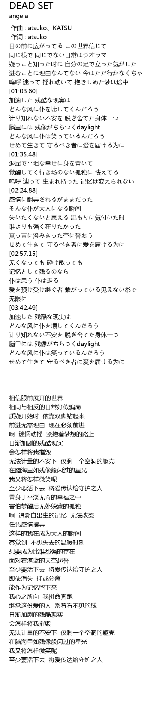 | [03:36.77] | 爱を预け受け継ぐ者 繋がっている见えない糸で 无限に |