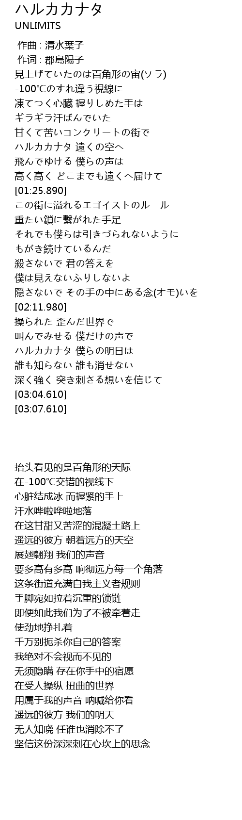 | [01:05.150] | ハルカカナタ 遠くの空へ |
