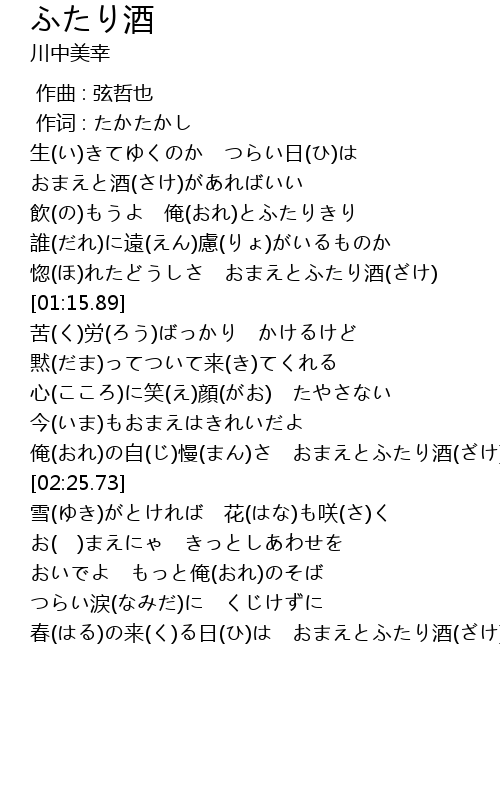 | [01:04.43] | 惚(ほ)れたどうしさ おまえとふたり酒(ざけ) |