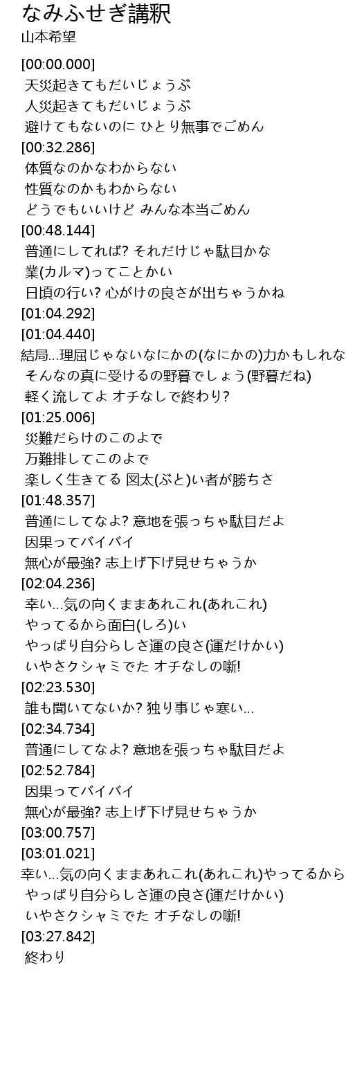| [03:01.021] | 幸い…気の向くままあれこれ(あれこれ)やってるから面白(しろ)い |