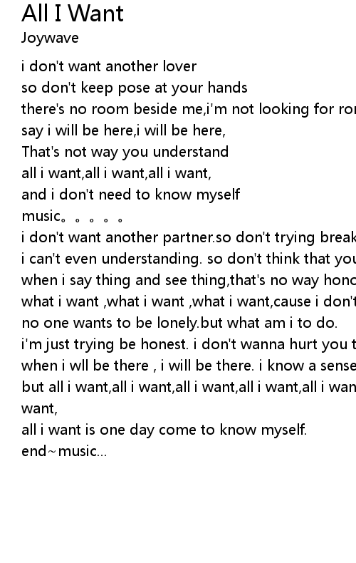 | [02:42.27] | but all i want, all i want, all i want, all i want, all i want, say all i want, |