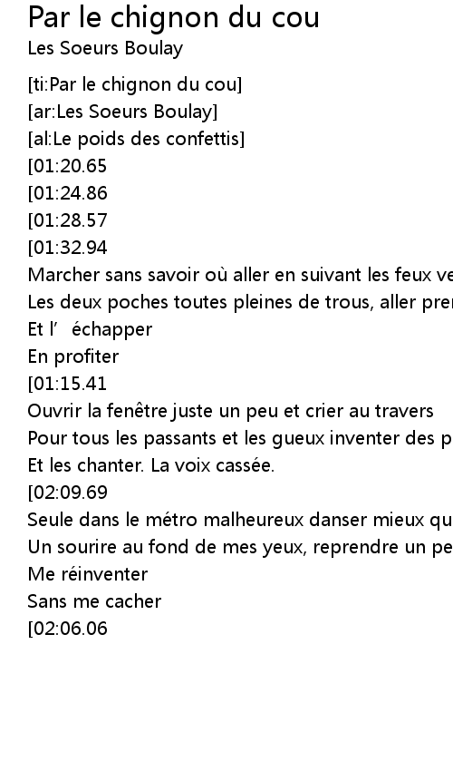 | [00:13.40][01:32.94][02:39.55][02:43.50] | Le c ur par le chignon du cou |