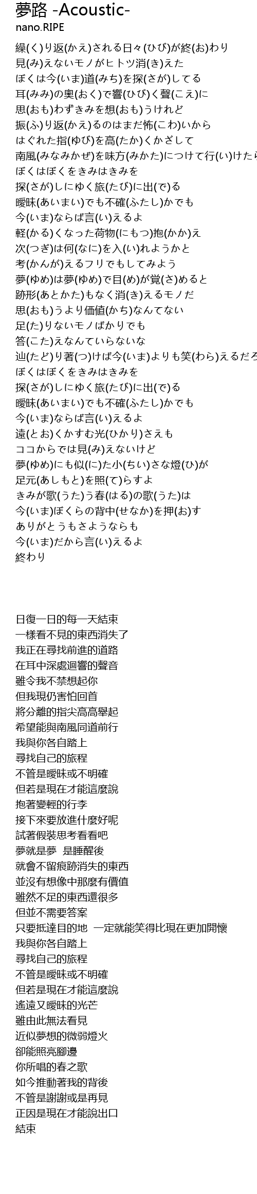 | [00:39.44] | ぼくは今(いま)道(みち)を探(さが)してる |