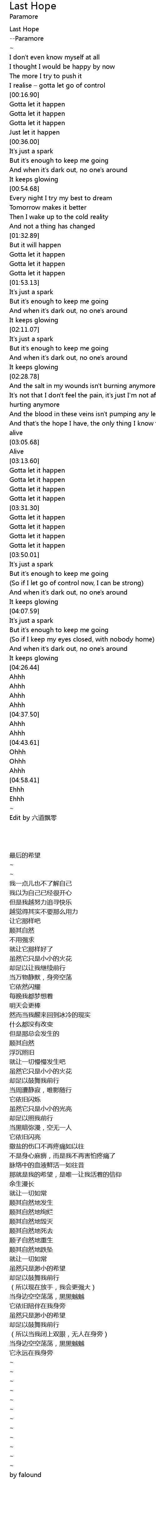 | [02:59.84] | And that' s the hope I have, the only thing I know that' s keeping me alive |