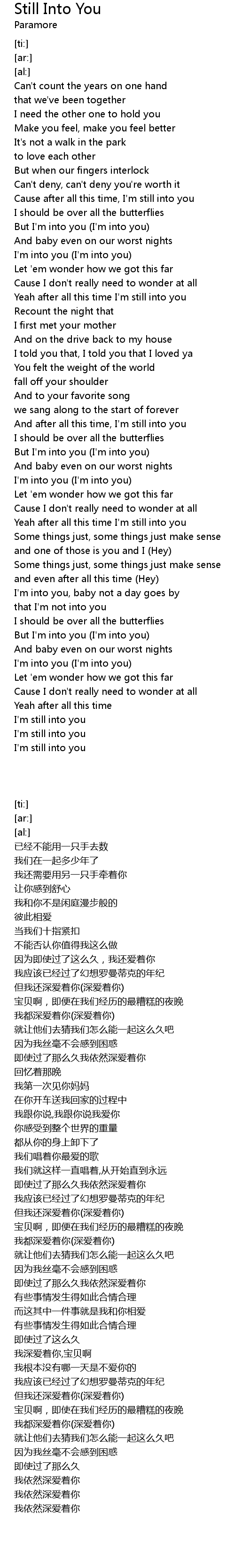 | [00:38.34] | Cause after all this time, I'm still into you |