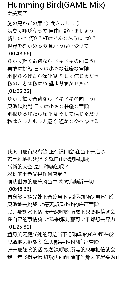 | [00:17.34] | 胸の鳥かごの扉 今 開きましょう |