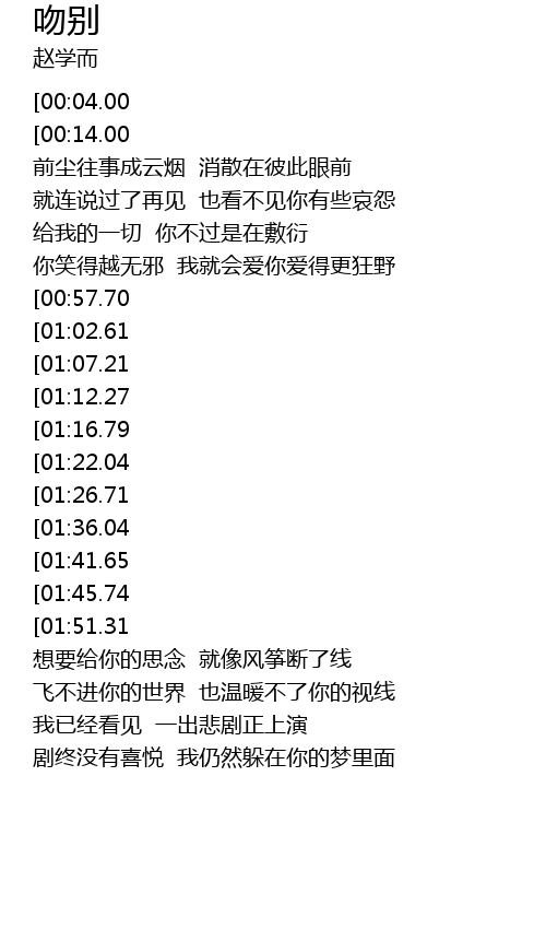 | [04:04.70][01:45.74] | 我和你吻别在狂乱的夜 |