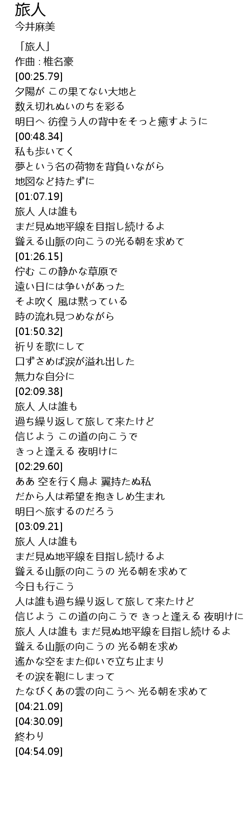 | [03:44.48] | 旅人 人は誰も まだ見ぬ地平線を目指し続けるよ |