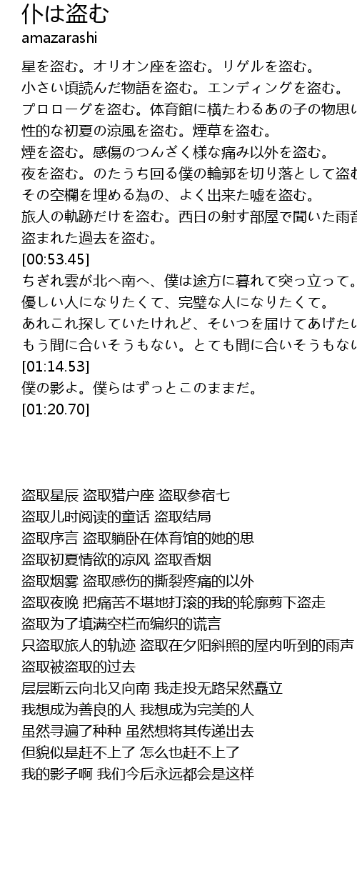 | [00:46.59] | 旅人の軌跡だけを盗む。西日の射す部屋で聞いた雨音を盗む。 |